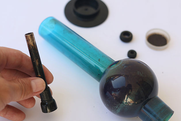 Vylejte z bongu vodu, vyndejte těsnění, chillum s kotlíkem a odendejte spodní stojan.